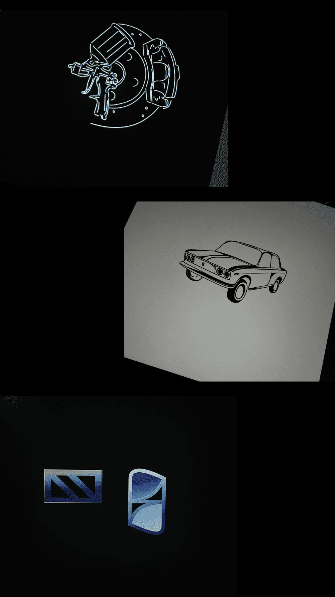 The visual style blends dark, sleek automotive aesthetics with highlight lighting inspired by metallic reflections and workshop environments.