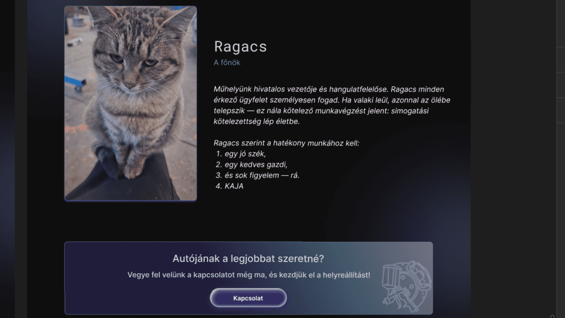 The result is a website that clearly presents services, builds trust, and brings the workshop’s character — including Ragacs, the “boss cat” — to life.