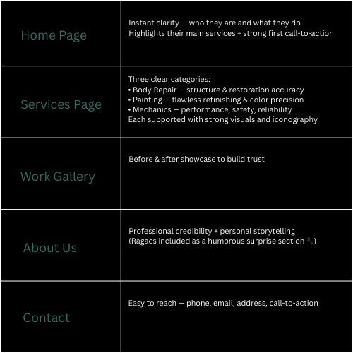The goal was to create a modern, trustworthy website that reflects both professional skill and the friendly personality of the workshop.